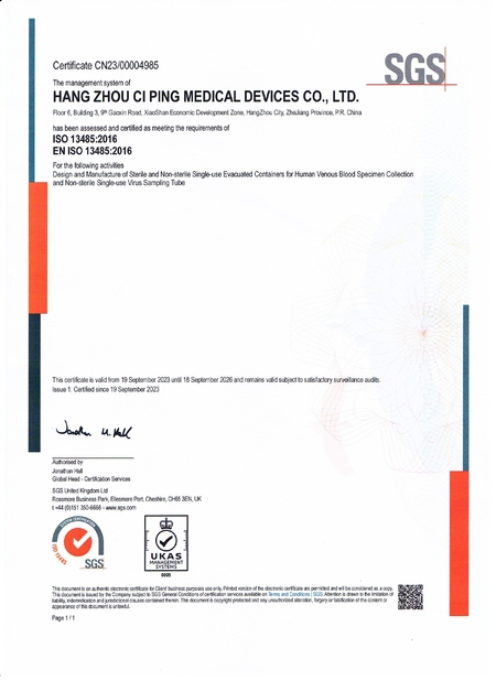 | Scope/Range: | Design and manufacture of sterile and non-sterile single-use evacuated containers for human venous blood specimen collection |